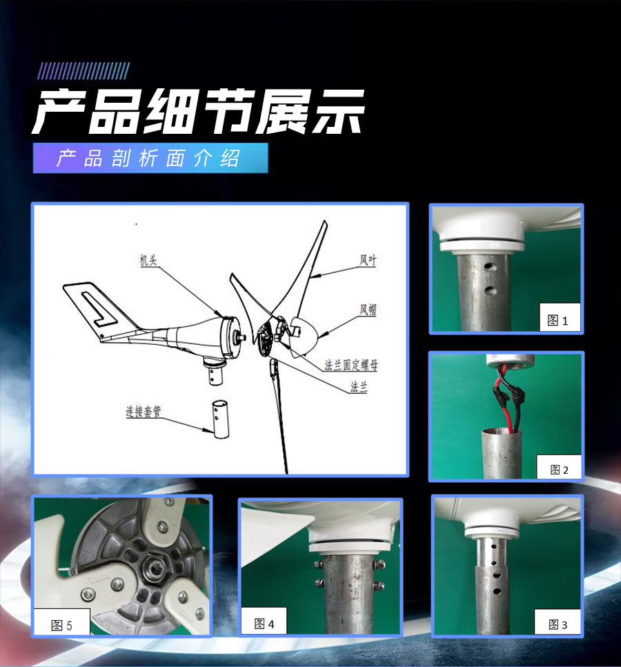 3、風葉采用高強度復合材料,強度高,韌性好,防紫外線,防腐蝕,抗大風,具有良好的氣動性能。